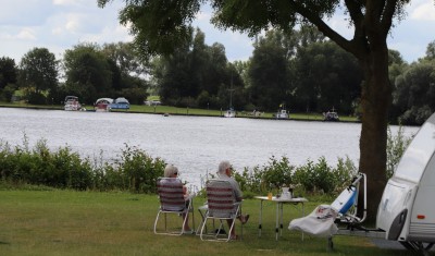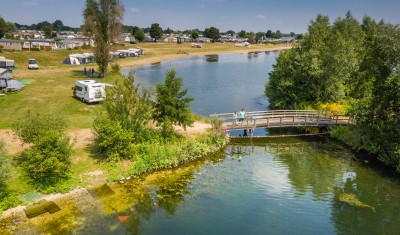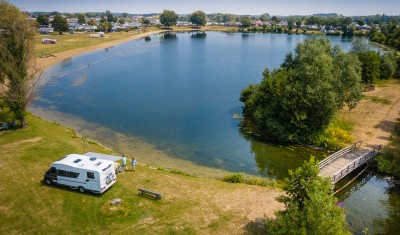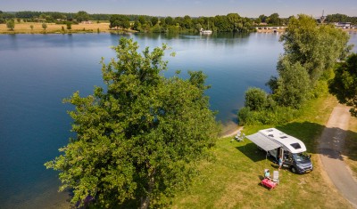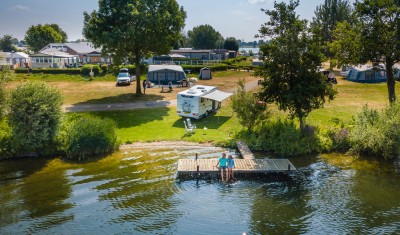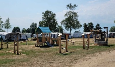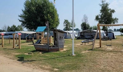 Klicken Sie auf die orangefarbenen „Luftballons“ auf der Karte, um sich einen Eindruck vom Sanitärgebäude, der Gastronomie oder dem Spielplatz oder der Aussicht auf die verschiedenen Campingplätze zu verschaffen.